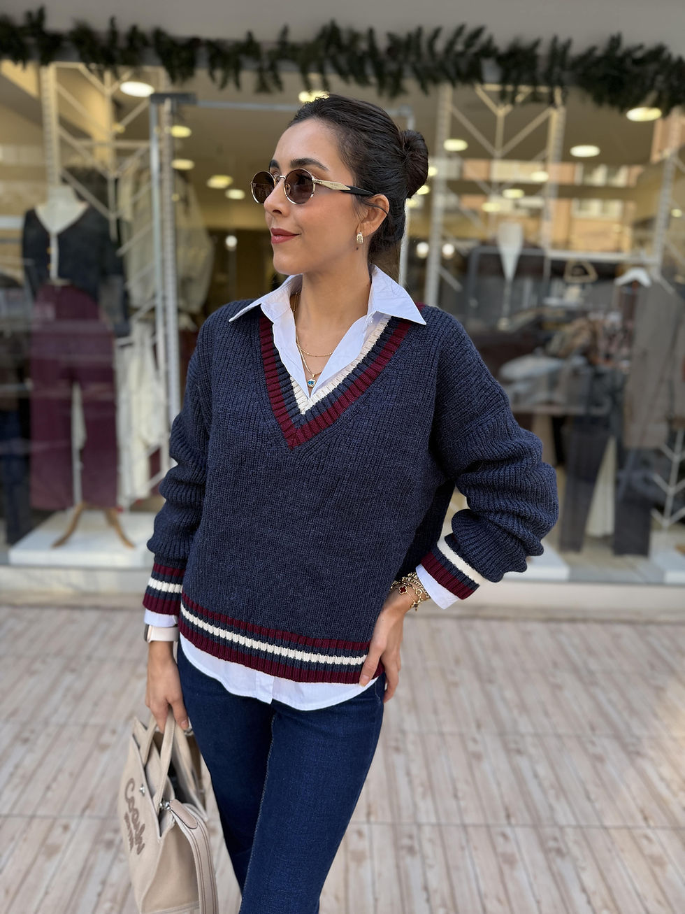 V-YAKA BORDO BEYAZ ŞERİTLİ KAZAK